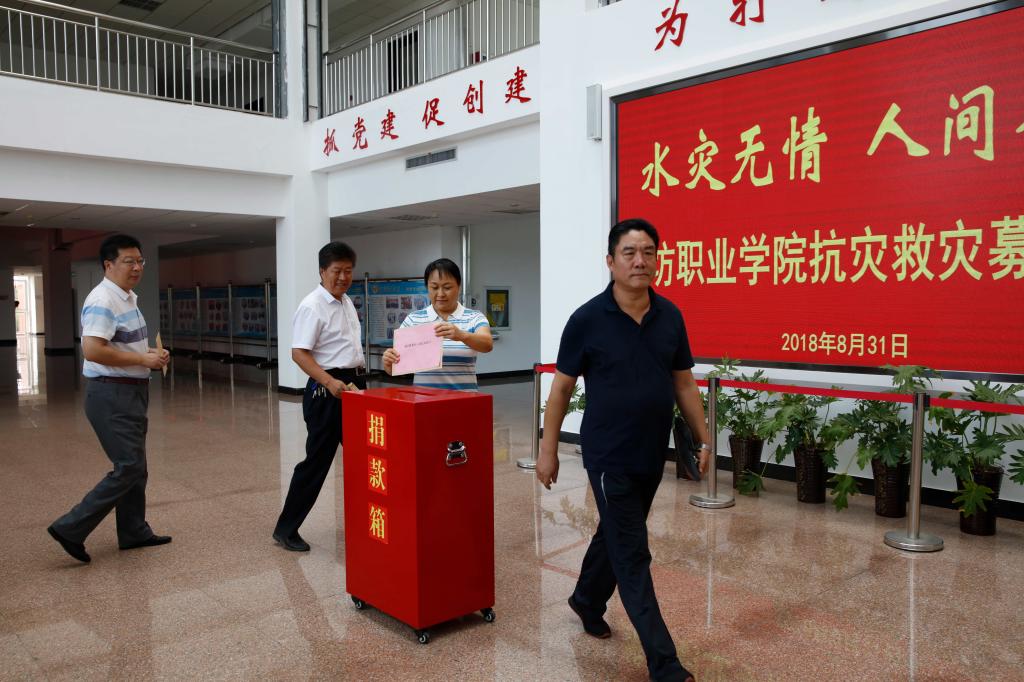 8月31日下午,学院在清泽楼一楼大厅举行“水灾无情,人间有爱——潍坊职业学院抗灾救灾募捐仪式”, 全体学院领导以及职能部门领导教职工参加了捐款仪式。