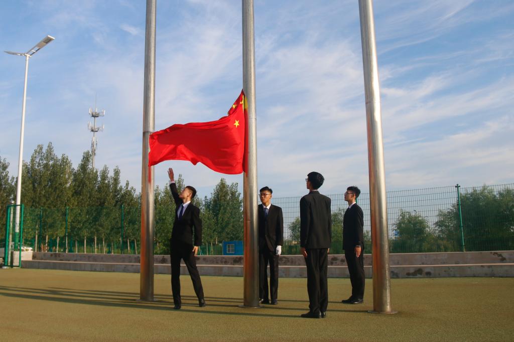 上午7点整,升旗仪式正式开始。学院国旗护卫队成员迈着铿锵的步伐来到了国旗台下。在激昂的国歌声中,鲜艳的五星红旗徐徐升起。全体唱国歌、行注目礼,庄严肃穆。