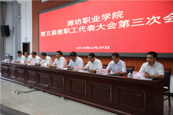6月29日,潍坊职业学院第五届教职工代表大会第三次会议在滨海校区清泽楼报告厅召开。学院党委书记张洪全,院长王家爱,党委副书记宋桂言,副院长赵君堂、贺志强、李瑞昌,纪委书记郭晓辉,党委委员、办公室主任谭明,工会主席王剑波等大会主席团成员出席大会并在主席台就座。大会正式代表252人参加了会议。开幕式由王家爱主持。