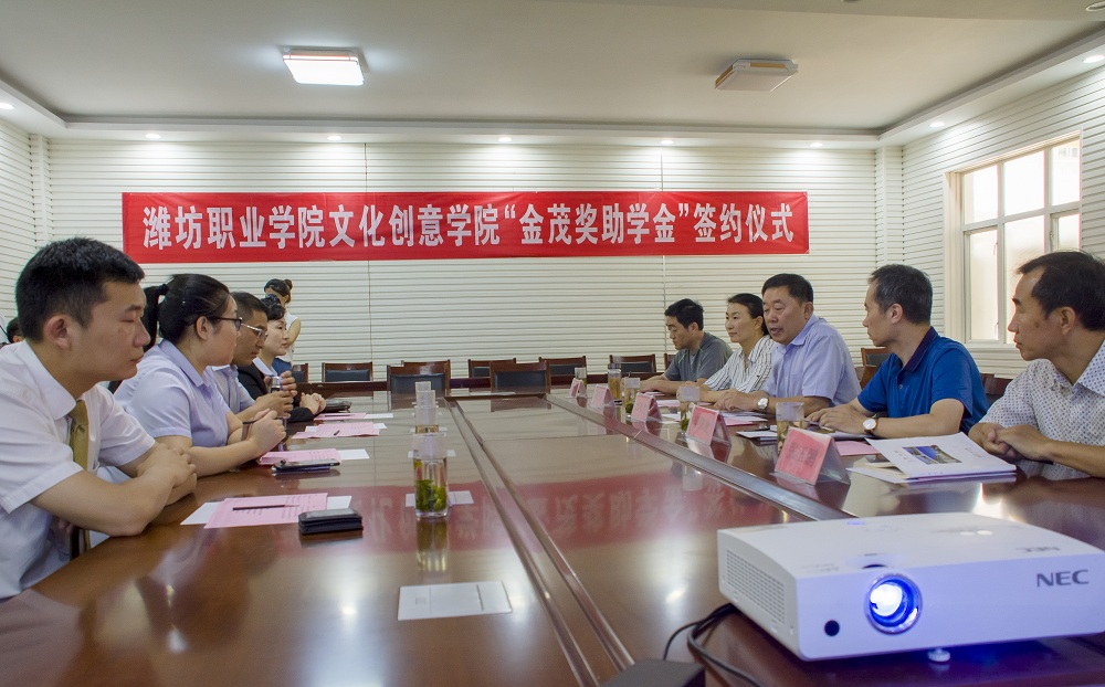 为帮助在校贫困生顺利完成学业,6月5日上午,我院文化创意学院与潍坊金茂国际大酒店在奎文校区大学生创业中心109室举行“金茂助学金”签约仪式。金茂国际大酒店董事长庄玉冰等一行4人参加仪式,学院党委副书记宋桂言出席并致辞。学院团委学生工作处、文化创意学院相关负责人及师生代表参加,文化创意学院院长梁国浚与金茂国际大酒店董事长庄玉冰签约。