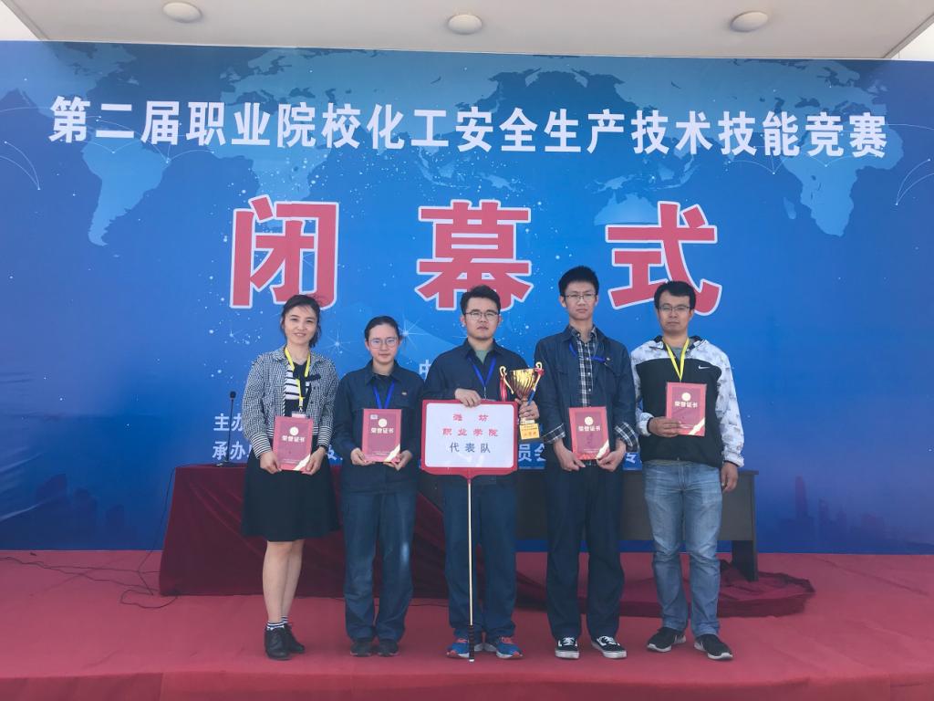 5月22日至5月24日,由全国安全职业教育教学指导委员会、中国化学品安全协会主办,全国安全职业教育教学指导委员会化工安全专业分委员会承办,华北科技学院、秦皇岛博赫科技开发有限公司协办的2018年全国职业院校化工安全生产技术技能竞赛在秦皇岛博赫科技园举办。此次大赛共有45支代表队135名选手参加,我院化学工程学院参赛学生胡恩政、陈彦霖和宋梦圆获得团体二等奖,获得B赛项全国第三名,两名教师获优秀指导教师称号。