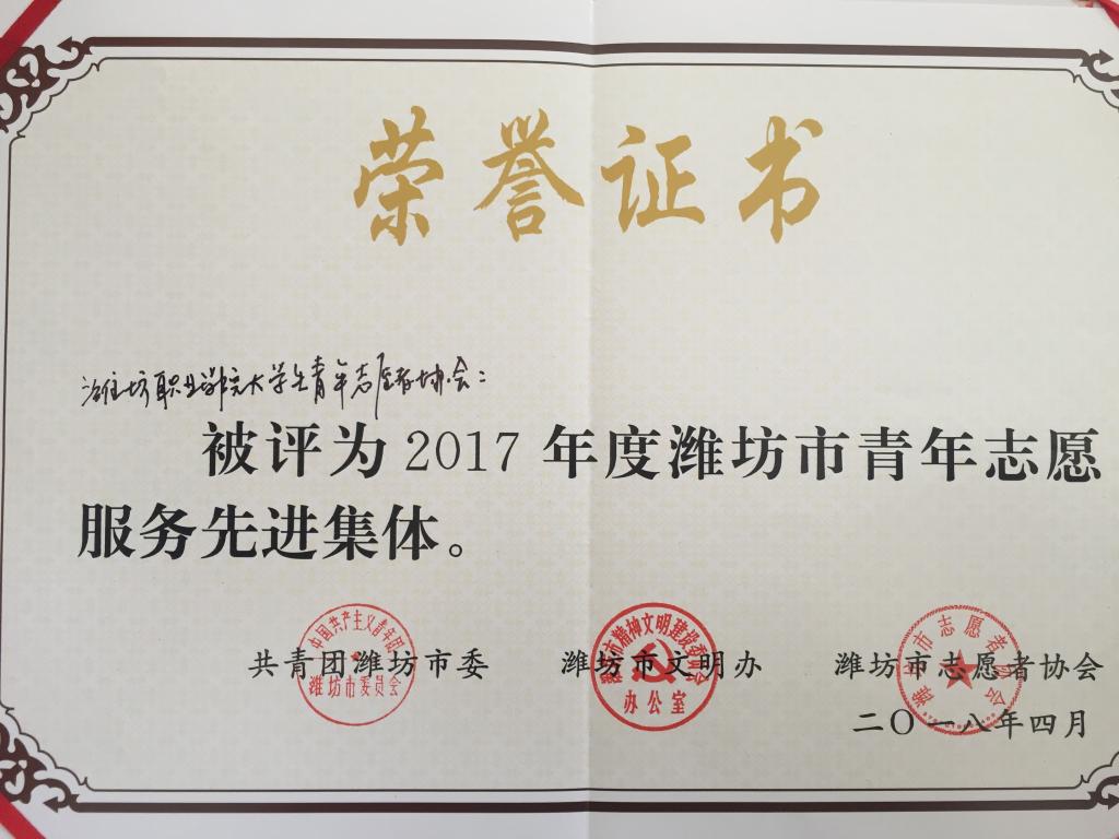近日,由共青团潍坊市委、潍坊市文明办、潍坊市志愿者协会联合组织开展的2017年度全市青年志愿服务先进集体和先进个人评选结果揭晓,我院大学生青年志愿者协会被评为“潍坊市青年志愿服务先进集体”,刘佳被评为“潍坊市青年志愿服务先进个人”。