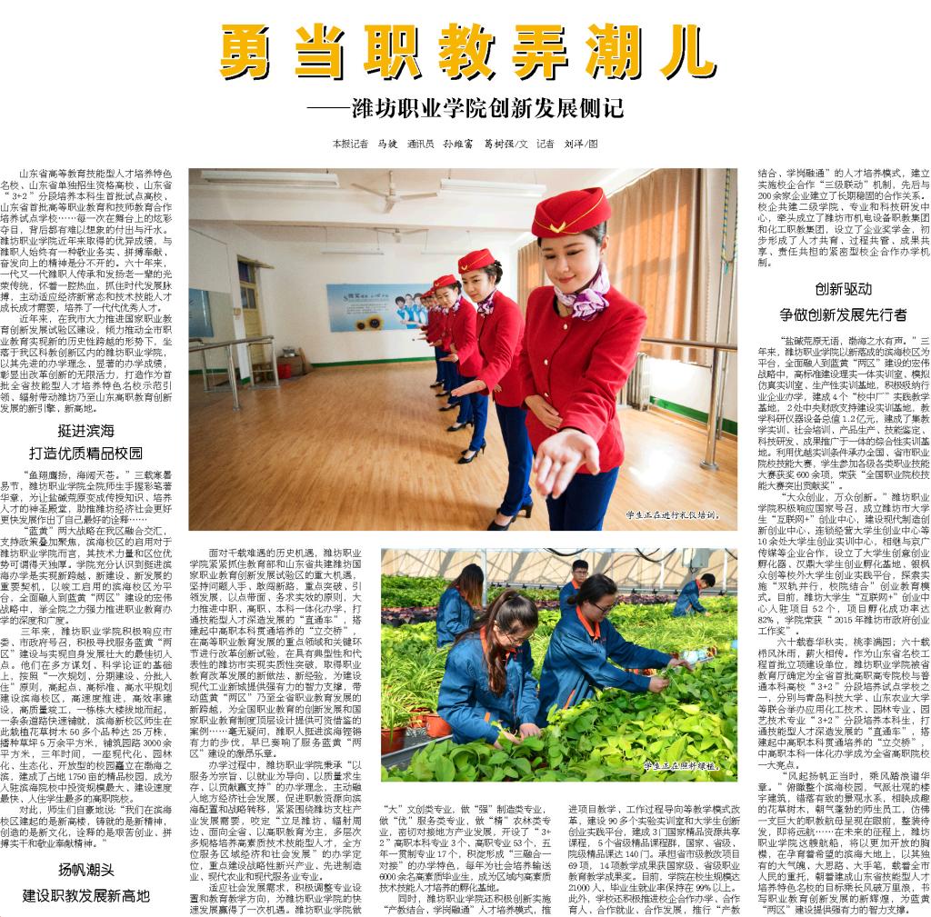 近年来,在我市大力推进国家职业教育创新发展试验区建设,倾力推动全市职业教育实现新的历史性跨越的形势下,坐落于我区科教创新区内的潍坊职业学院,以其先进的办学理念、显著的办学成绩,彰显出改革创新的无限活力,打造作为首批全省技能型人才培养特色名校示范引领、辐射带动潍坊乃至山东高职教育创新发展的新引擎、新高地。