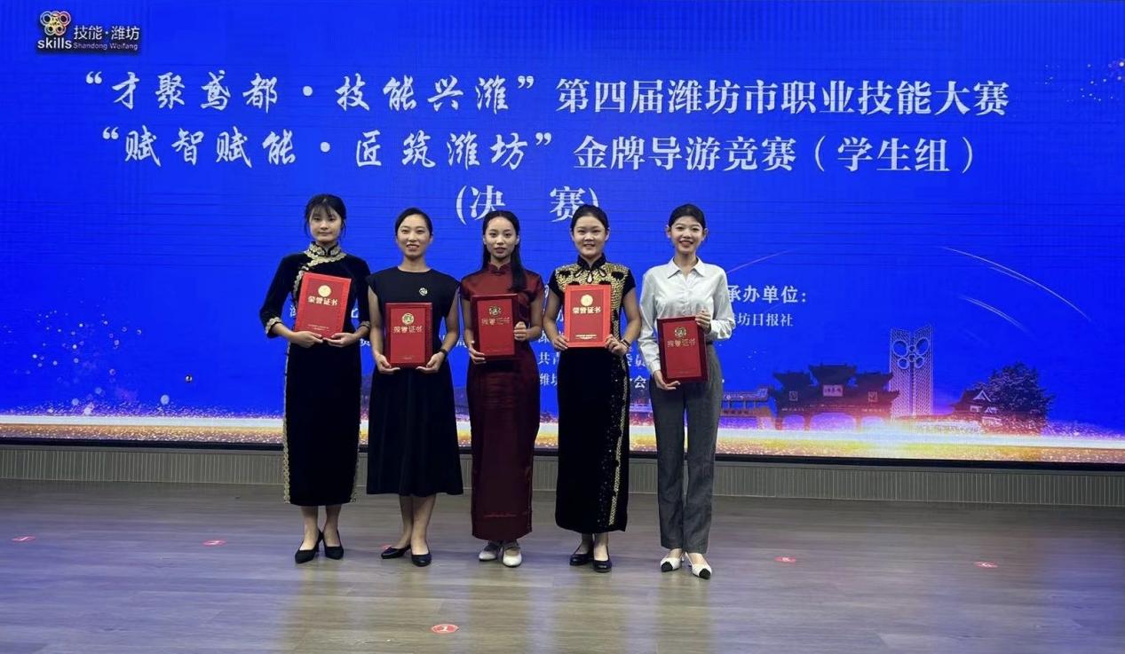 9月26日,“才聚鸢都、技能兴潍”第四届潍坊市职业技能大赛——“赋智赋能、匠筑潍坊”金牌导游竞赛(学生组)在潍坊日报社融媒演播厅举行。国际商务学院旅游管理专业5名同学,在教师刘杰、谭悦芬、谭娜指导下,沉着应战,以精彩的表现,最终斩获二等奖2项和三等奖3项。