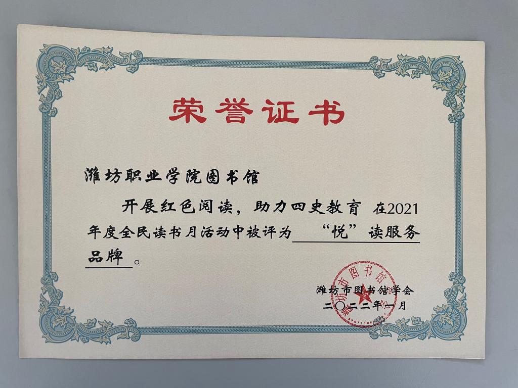 近日,由潍坊市图书馆学会组织的“2021年度全民读书月活动”圆满落下帷幕。我院图书馆依托丰富的文献信息,通过主题展览、业务知识培训、经典书目推荐、红色阅读推广、阅读达人评选等系列活动,被市图书馆学会授予“2021年度全民读书月先进单位”;“开展红色阅读,助力四史教育”主题获“潍坊市‘悦读服务品牌’”。