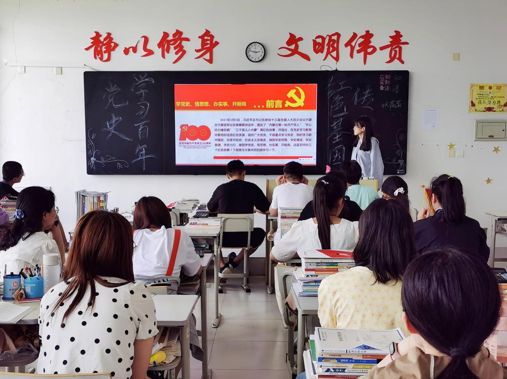 主题团课上,各班团支书带领同学们认真学习习近平总书记在党史学习教育动员大会上的重要讲话精神,深刻领会党史学习的重大意义。通过PPT向同学们讲述了中国共产党的百年历程及发展历史,组织同学们共同观看了关于建党100周年风雨历程、革命烈士英勇事迹的视频,让同学们更加深刻了解那段充满战争硝烟的历史,感受老一代共产党员们的伟大与艰辛,学习黄继光等革命烈士的英勇事迹,使红色基因印在脑海、融入血脉,引导青年大学生争做红色基因的传承者。最后,同学们展开交流,谈论自己对中国共产党建党100周年来取得的成就的认识,分享党史学习感悟与心得。