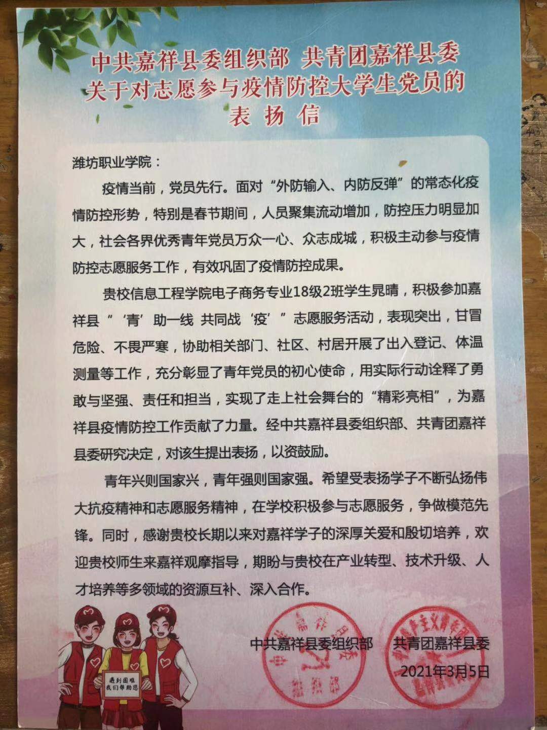 近日,信息工程学院团总支收到中共嘉祥县委组织部、共青团嘉祥县委送来的一封感谢信,感谢我院2018级电子商务2班晁晴同学在春节期间积极主动参加疫情防控志愿服务工作。一封感谢信,不仅是潍职学子在用实际行动诠释勇敢与坚强、责任与担当,更是“崇实尚行 敢于争先”潍职精神的体现。