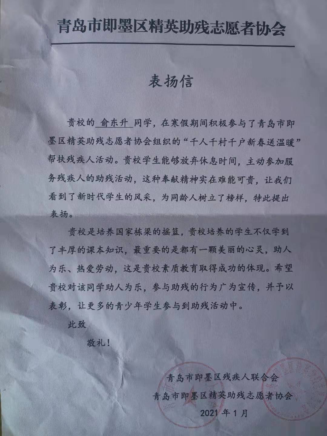 近日,机电工程学院收到了来自青岛市即墨区残疾人联合会的表扬信,表扬我院2020级机电一体化技术五班的俞东升同学在寒假期间积极参与了青岛市即墨区精英助残志愿者协会组织的“千人千村千户新春送温暖”帮扶残疾人活动。