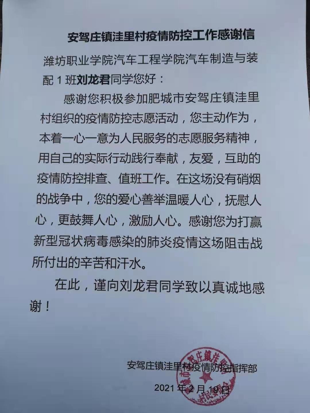 近日,汽车工程学院收到肥城市安驾庄镇洼里村两委送来的感谢信,感谢我院2020级汽车制造与装配技术1班学子刘龙君在疫情防控工作中所做的贡献,一张薄薄的信纸寄托了一份浓浓的感激之情,折射出潍职青年学子敢于奉献担当的精神。