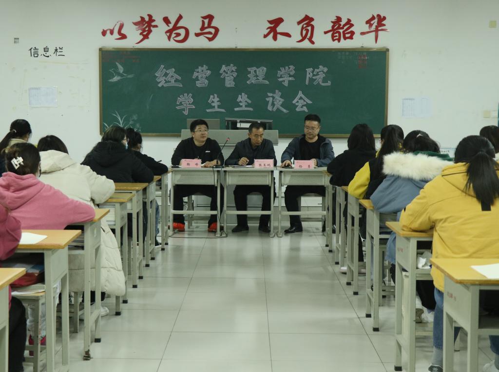为了进一步落实“以生为本”的理念,突出“为学生服务”的宗旨,全面了解学生对学校的教育教学、学习生活以及生活服务等方面的问题、意见和建议,切实做好学生管理工作,营造良好的育人和学习环境,11月12日下午,经营管理学院在惠泽1号楼A区214教室组织召开学生座谈会。会议由经营管理学院党总支负责同志主持,2017级五年制、2019级、2020级不同专业学生代表、班主任及经营管理学院负责学生管理工作的同志参加会议。