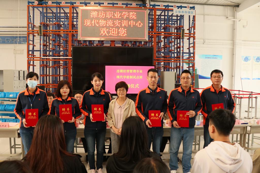 10月10日,我院与山东京东快星供应链科技有限公司联合举办的物流管理专业现代学徒制班、与山东潍坊百货集团股份有限公司佳乐家超市联合举办的连锁经营管理专业代学徒制试点班拜师仪式分别在沐泽楼智慧物流实训中心和现代物流实训中心举行。经营管理学院的主要负责同志及相关企业的领导和师傅,以及60名现代学徒制试点班的学生参加了拜师仪式。