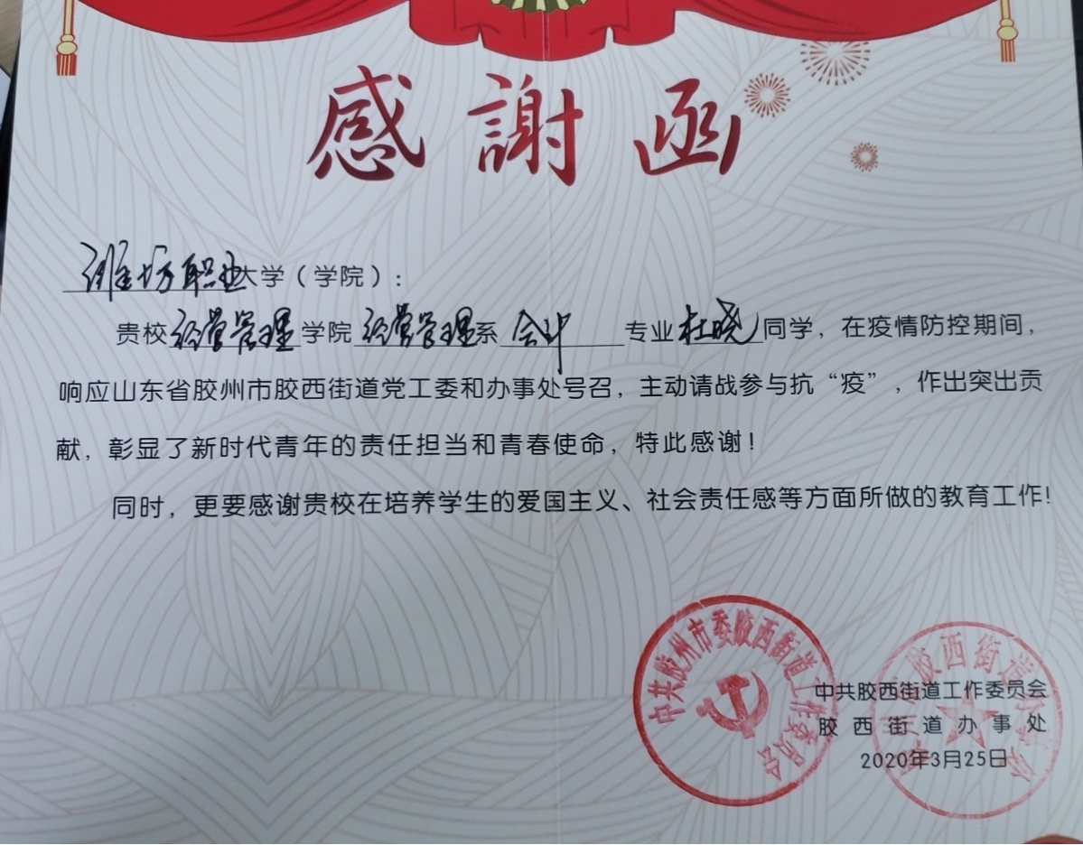 近日,经营管理学院收到中共胶州市委胶西街道工作委员会发来的感谢信,感谢我院2018级会计专业7班杜晓同学为疫情防控工作做出的贡献。