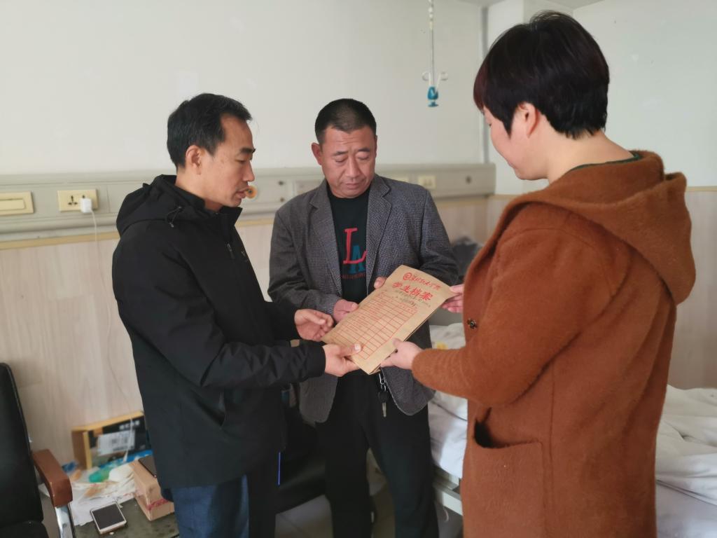 10月29日上午,经营管理学院党支部主要负责同志、辅导员办公室(团总支)老师以及学生班主任老师前往诸城市中医院看望身患重病的我院18级学生王永青同学,并将凝聚着全院教师爱心的14899.5元的捐款交给王永青同学家长。