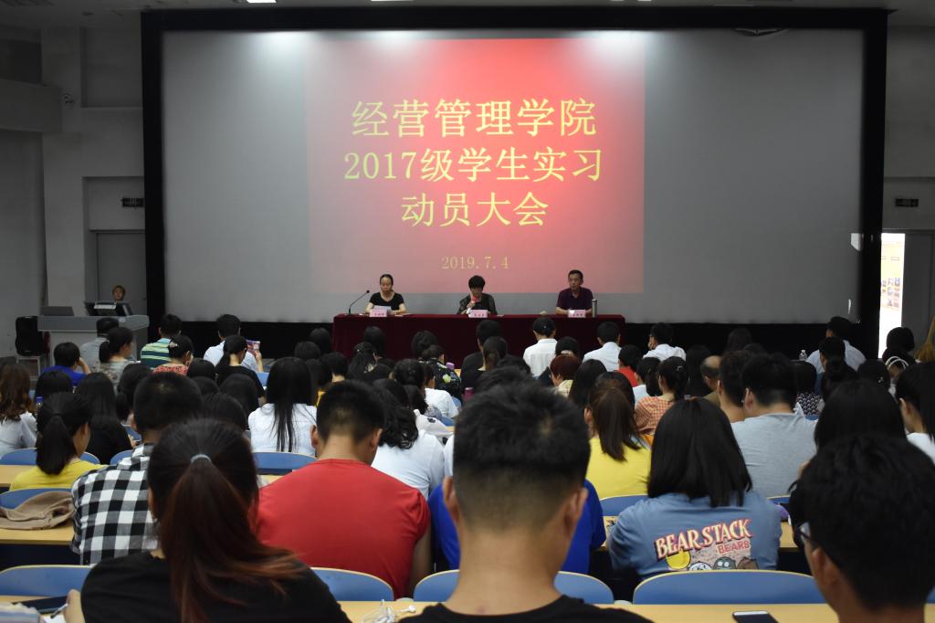 7月4日,经营管理学院2017级学生实习动员大会在惠泽2号楼A117报告厅召开。经营管理学院班子成员、科室负责人、实习指导教师、辅导员、班主任及学生代表300余人参加了本次动员大会。