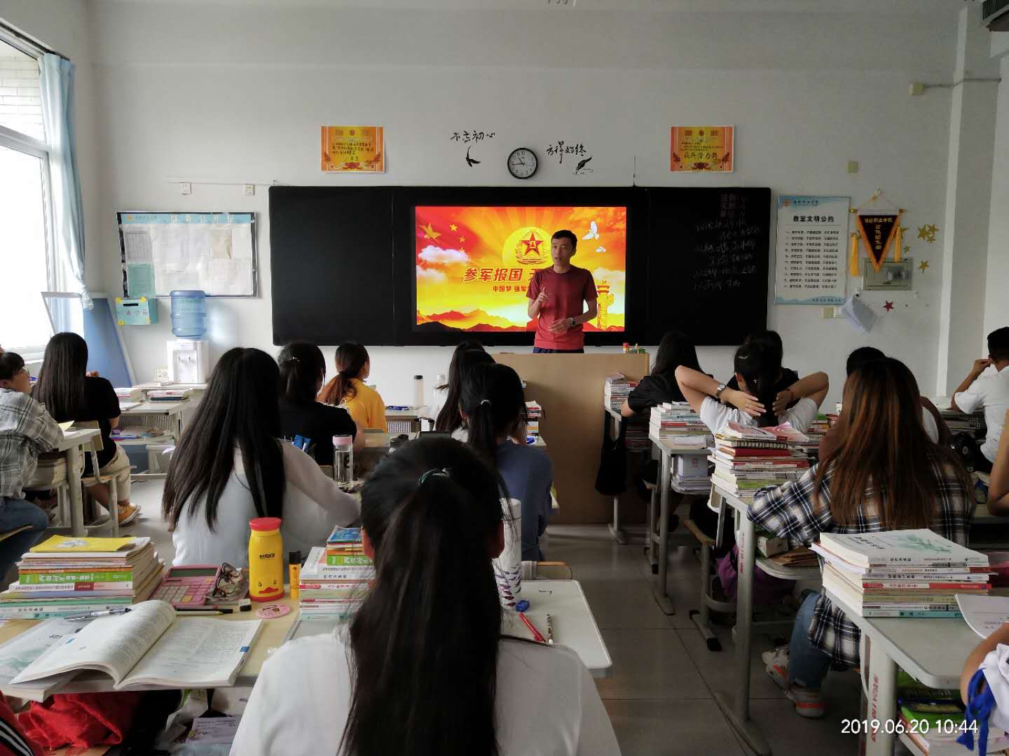 班会主要由各班主任向同学们讲解2019年大学生征兵工作的相关内容和国家征兵入伍流程、优先优待、选用培养、复学升学、就业服务、应征条件等优惠政策,并对报名、体检、政审及预征定兵时间安排情况、学费补偿、学籍保留及未来发展等同学们关心的热点问题进行了详细讲解,鼓励同学们做好职业规划,到军营中体验别样青春、书写精彩人生,用青春热血助力强军梦想。