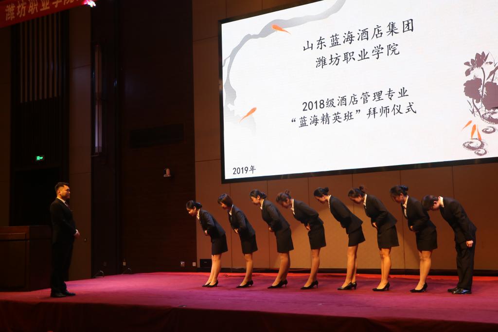 5月29日下午,潍坊职业学院国际商务学院第二届“蓝海杯”酒店服务技能大赛决赛暨“蓝海精英班”现代学徒制拜师仪式在潍坊蓝海大饭店成功举办。蓝海集团人力资源中心副总经理杨兆永、招聘总监王利、国际商务学院院长褚志梅、党支部副书记于涛、副院长辛国庆及产学负责同志参加了活动。