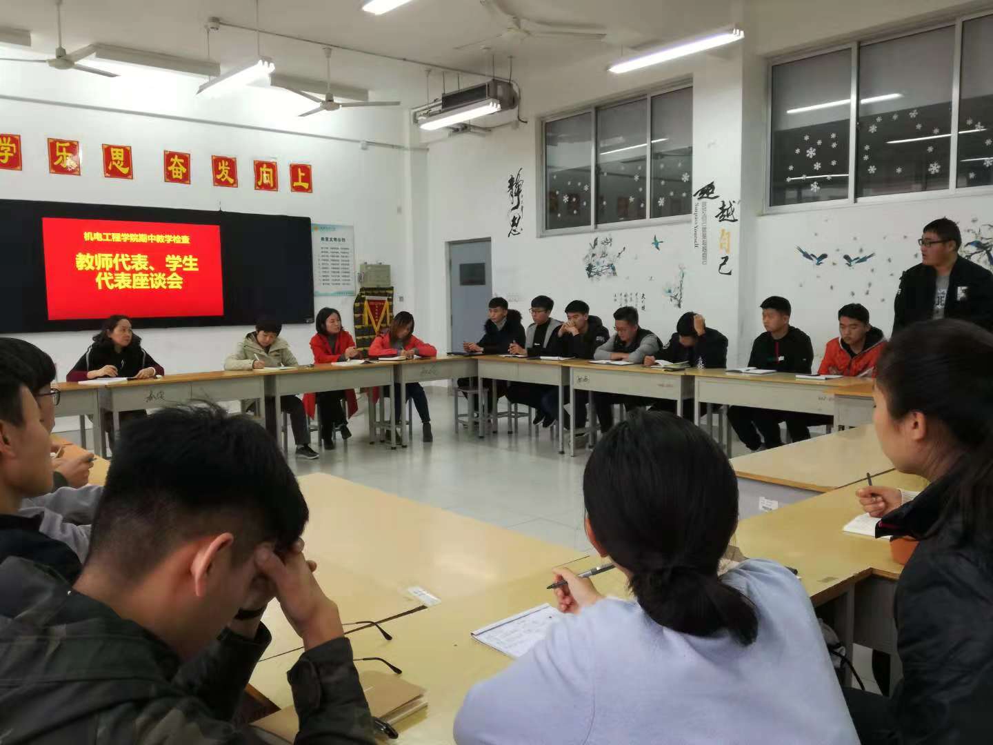 为更好地了解我院教育教学现状,广泛收集教师与学生对学院教学管理工作的意见和建议,努力营造良好的教育教学氛围。机电工程学院于11月15日下午在惠泽2号楼A207教室召开机电工程学院教师代表、学生代表座谈会。机电工程学院任课教师代表、教学管理办公室成员和在校各班级的学生代表参加了此次会议,座谈会由周荃老师主持。