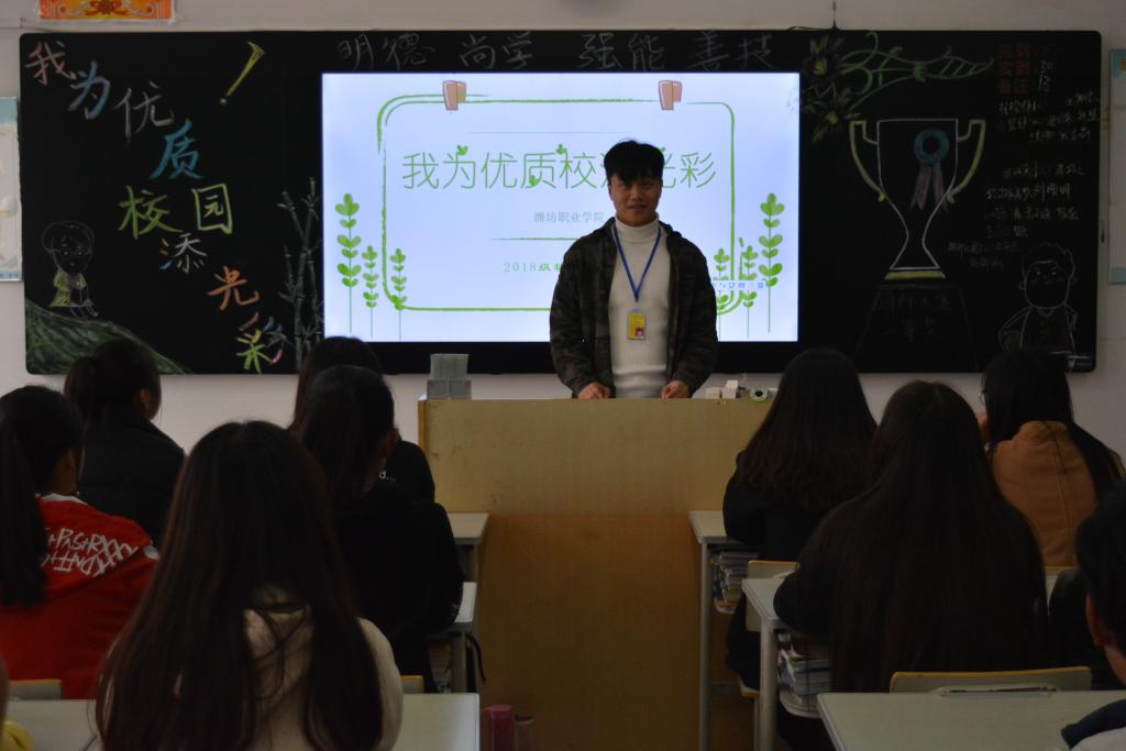 在班长和团支书的组织下,同学们一起学习了优质校建设的有关材料,确保每位同学都了解优质校的相关项目,树立主人翁意识,号召同学们从自身做起,关注身边的点滴小事,为优质校增光添彩。此外,各班通过视频的形式将学院的发展历程逐一呈现出来,介绍了潍坊职业学院的校风校纪以及近年获得的各项荣誉,让每一位潍职学子深切地感受到学校的发展壮大。有感而发的同学们将自己在学校的日常点滴与大家分享,畅谈对于优质校建设的认识,表达了他们为优质校建设添光彩、做贡献的决心。
