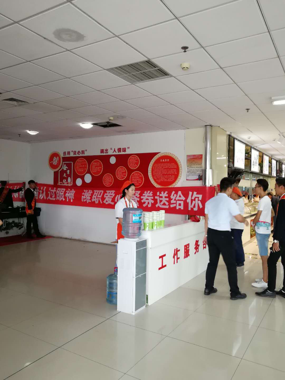 9月15日新生报到,新生和家长近万人来到学院,从早餐开始,整个餐厅,就餐人员络绎不绝,餐厅工作人员始终热情周到服务,及时为远道送学生和家长送上爱心餐券,还免费提供水果,矿泉水等,展示了我院餐厅工作人员良好的精神风貌。