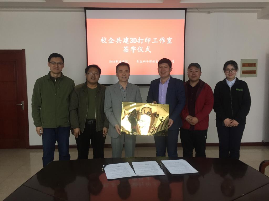 4月12日上午,文化创意学院与青岛蜗牛影视策划有限公司校企共建3D打印工作室签字仪式在奎文校区11号楼会议室举行。文化创意学院主要负责人及相关人员、青岛蜗牛影视策划有限公司总经理崔明鹏等出席仪式。