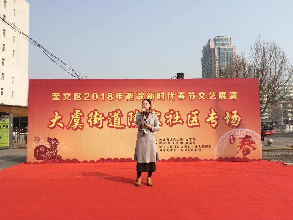 3月10日下午,我院学生志愿者参与大虞街道陈家社区举行2018年讴歌新时代春节文艺展演,此次展演由大虞街道党工委、办事处主办,由陈家社区党委、居委会、奎文区政协社会福利与社会保障界承办。演出在百姓观众的热烈掌声中开始,我院学生一首《时间都去哪了》,嗓音优美、情感充沛,台下观众为之动容;一曲《Call me maybe》,动感欢快,赢得了观众的掌声和欢呼;更有社区成员们精心编排的舞蹈《正月里来闹新春》、汉族舞《烟花三月》、《红梅花又开》,京剧《智取威虎山》将中华优秀传统文化尽数展现。演出现场,掌声不断,虽然冬天的凉意还没有消退,但演出舞台热闹非凡,演员们表演情绪高涨,点燃了观众的热情,演出得到了老百姓们的一致好评。