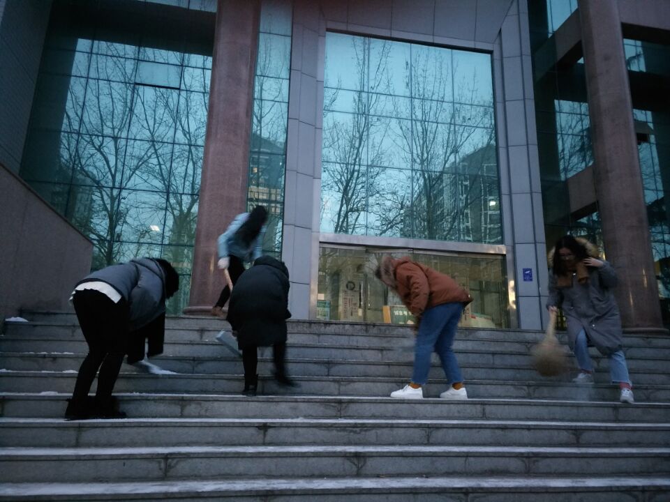 志愿者们冒着严寒、分工有序、配合默契、干劲十足,经过近1个小时的辛勤劳动,楼前台阶和主干道的积雪被清除干净,恢复了雪前的安全便利。志愿扫雪活动使学生在参加公益活动中感受奉献的乐趣,有利于培育学生的责任感和主人翁意识,为学生全面发展奠定了基础。(李献媛供稿)