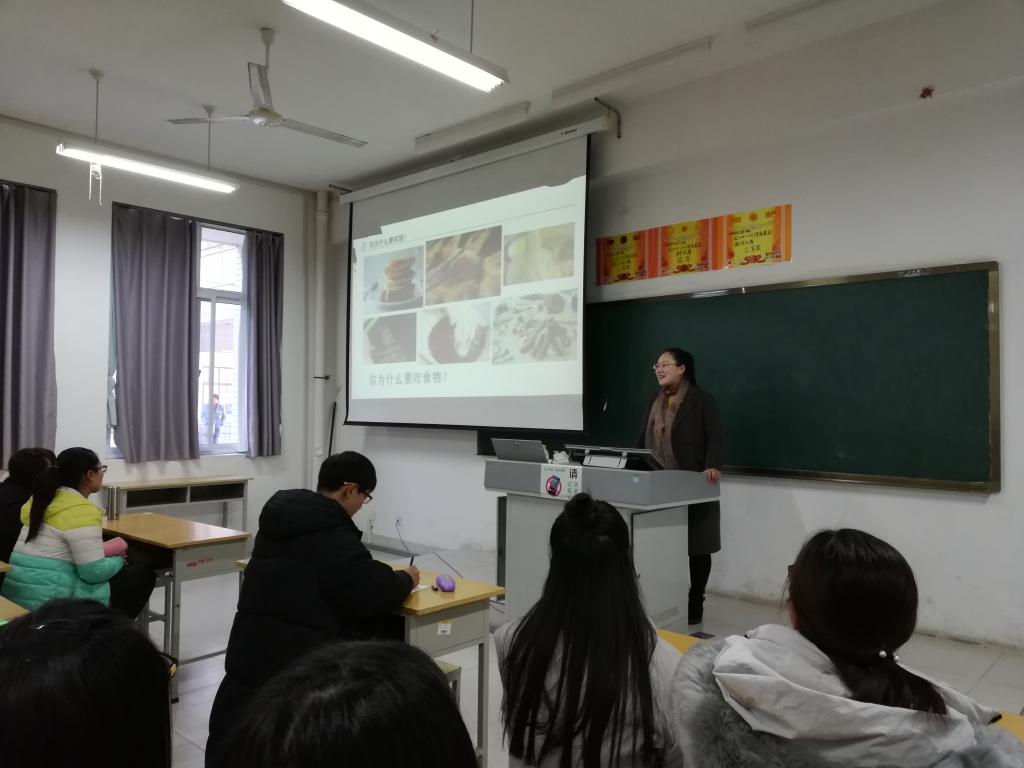 食品药品学院美味坊加工社团11月22号在惠泽1号楼B区116多媒体教室举办了“青春加油站”食品营养知识讲座,来自全校的近100名学生参加了此次活动。本活动是学院第十二届社团文化艺术节活动项目之一。