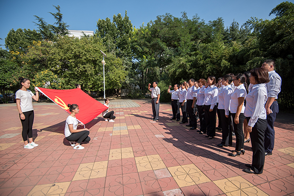 党员同志们佩戴党徽,面向党旗,在领誓人带领下,重温了入党誓词,再一次接受心灵的洗礼。全体教师面向国旗,仪态端庄,队列整齐,在领誓人带领下,庄严宣读了潍坊职业学院教师誓词,以坚定洪亮的宣誓声做出牢记教书育人使命、恪尽职守、履职尽责的承诺。