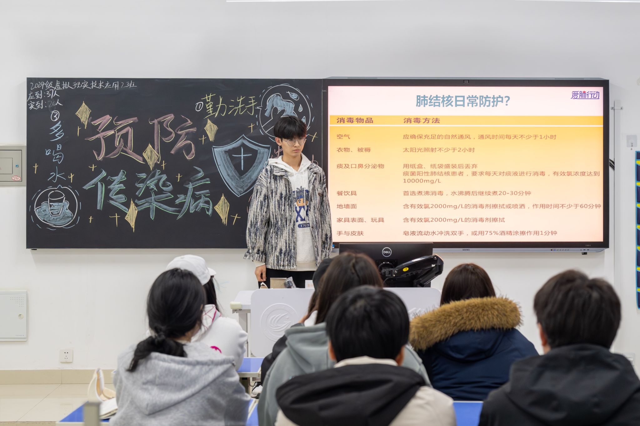 活动期间,各班级辅导员与学生干部充分利用多媒体资源,围绕结核病的基本知识、传播途径和预防措施等核心内容,结合真实案例,深入浅出地为同学们讲解结核病的发病机制与传播方式。通过生动的讲解,同学们深刻认识到结核病防治不仅关乎个人健康,更对社会公共卫生安全具有重要意义。辅导员老师在活动中积极倡导同学们增强自我保护意识,从日常生活中的点滴做起,携手筑牢校园结核病防控的坚固防线。同学们热情高涨,积极参与讨论,踊跃发言分享自己的学习心得与防护计划。