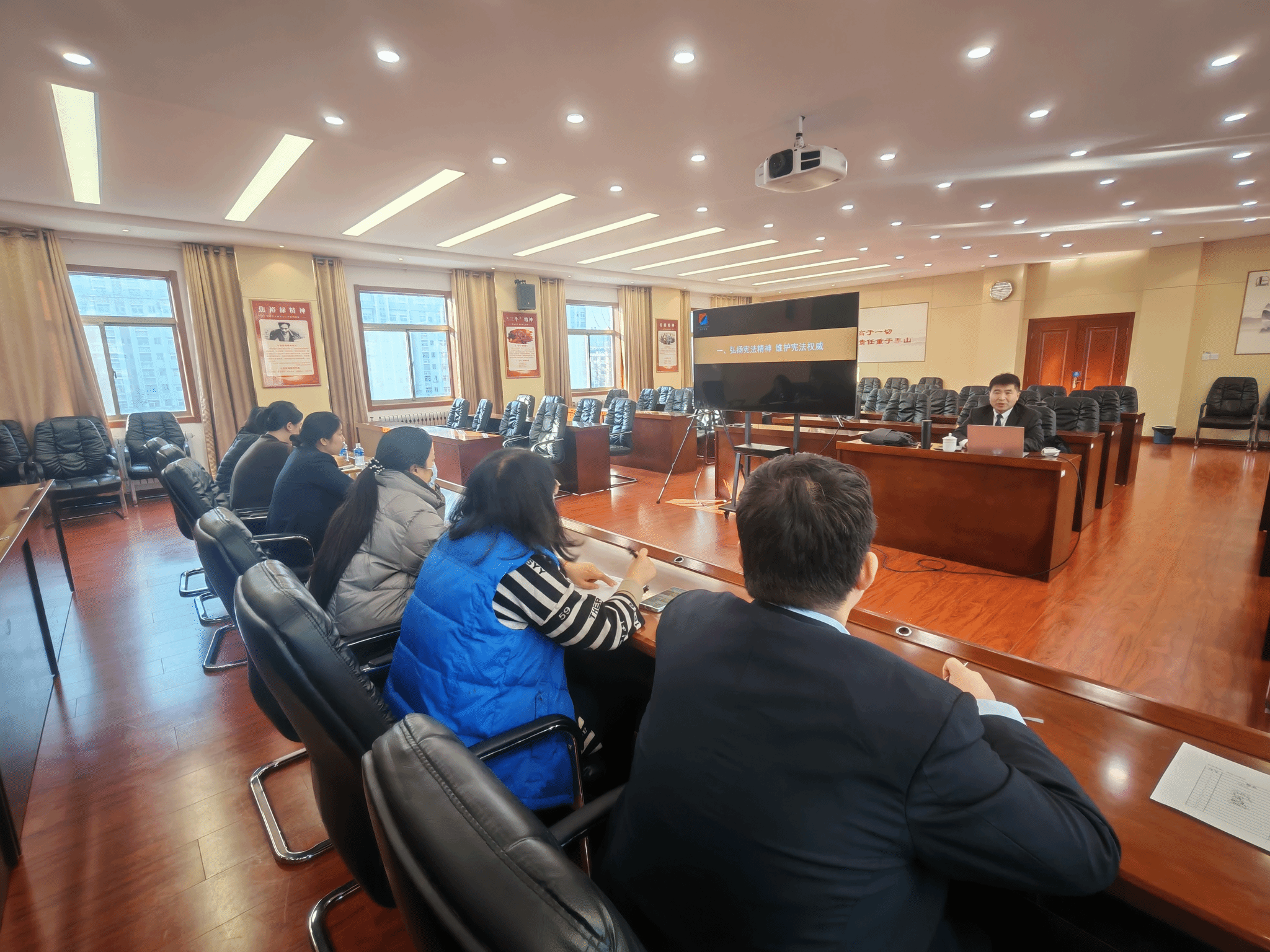 讲座中,孙老师结合宪法核心要义与实务案例,从宪法的地位作用、公民基本权利义务、宪法实施与监督等方面展开讲解,深入解读习近平法治思想“十二个坚持”的丰富内涵,通过齐玉苓案、潘洪斌案等典型案例,生动阐释宪法与企业经营、职工生活的密切联系,引导干部职工树立宪法意识、增强法治观念。