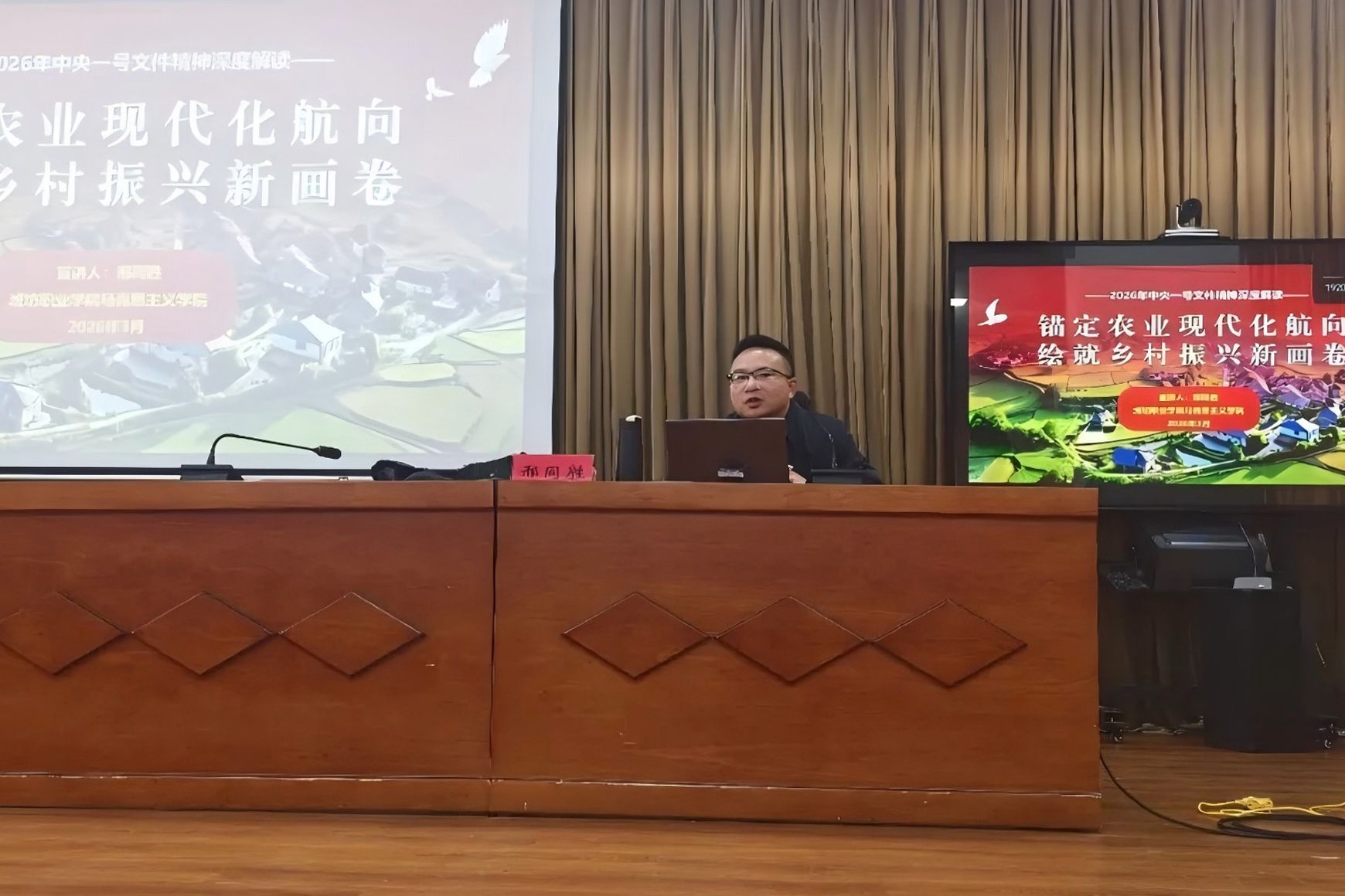 邢同胜以“锚定农业现代化航向,绘就乡村振兴新画卷”为主题,对2026年中央一号文件精神进行了系统深入的解读。他从“锚定农业农村现代化”的核心要义切入,深刻阐释了学习运用“千万工程”经验的引领作用、守牢粮食安全和防止规模性返贫两条底线的战略要求,以及提升乡村产业发展、乡村建设、乡村治理三大水平的重点任务。他紧密结合文件中的关键提法,用通俗易懂的语言帮助参训人员准确把握“三农”工作的新形势新要求,推动党的惠农政策从“文件语言”转化为“百姓心声”。
